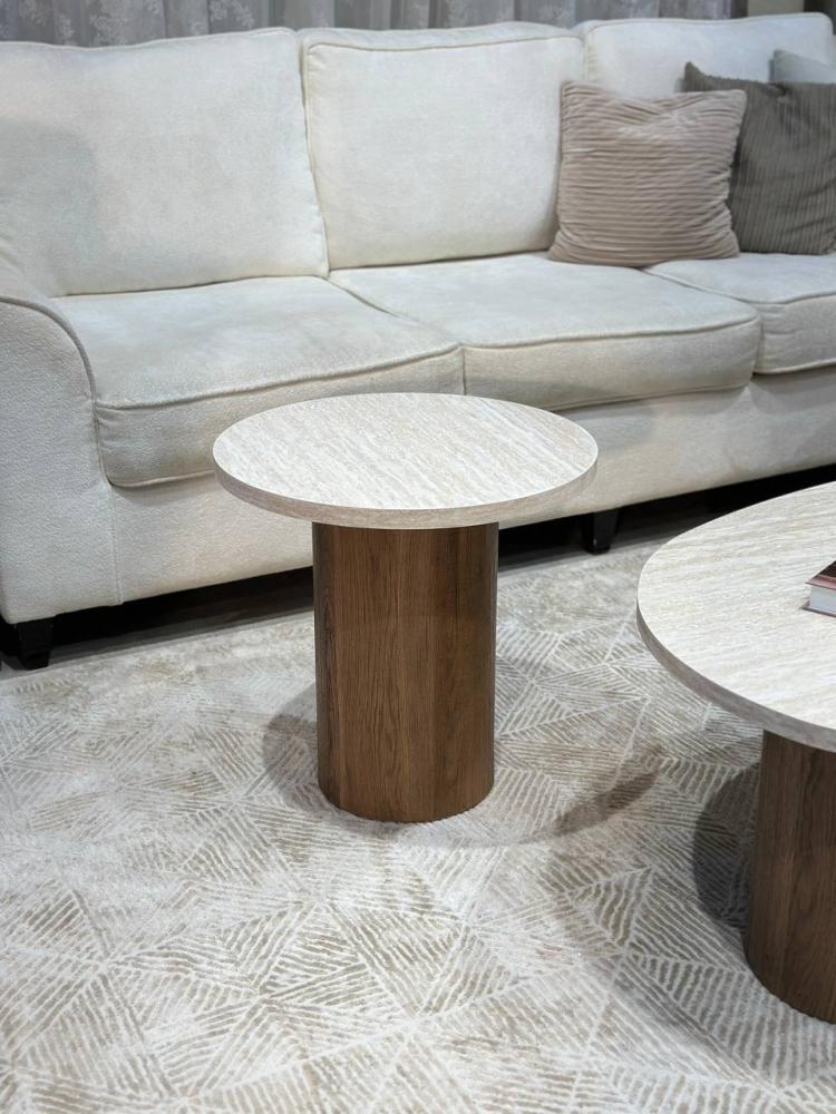 يتميز الطقم بسطح فاخر من بديل الرخام وقواعد خشبية بلون بني دافئ تضفي دفئاً وأناقة على أي مساحة.